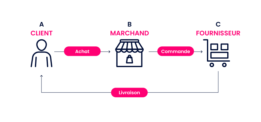 Le marchand reçoit une commande Client (A) qui génère à son tour une commande fournisseur (C).